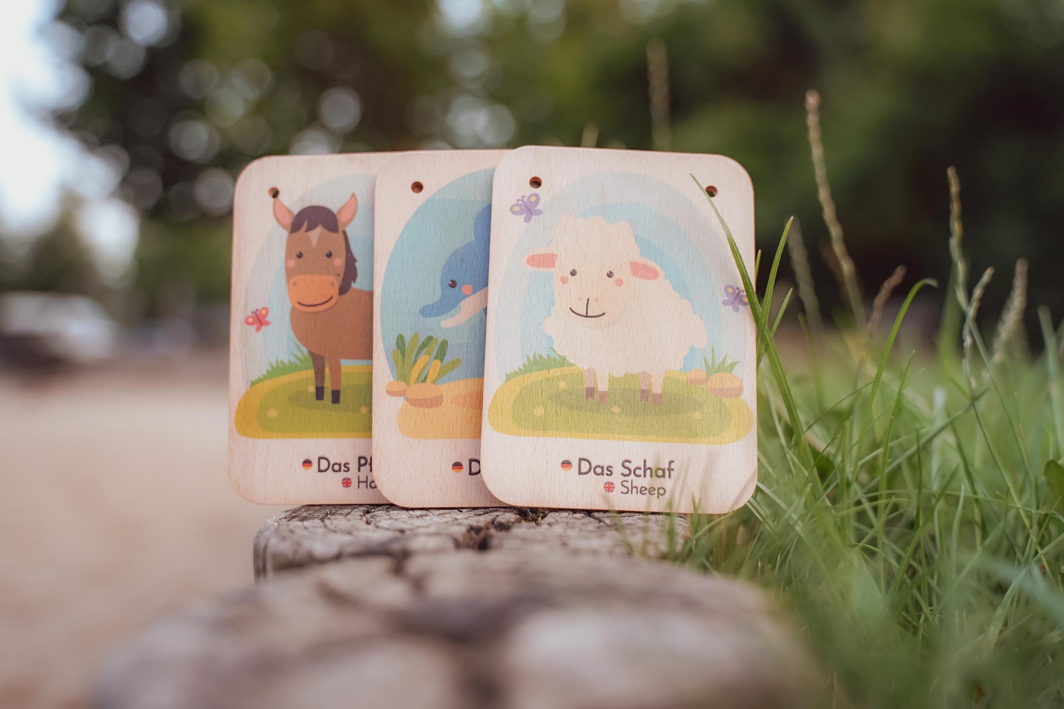 This is how the idea of Bee Baby learning playing cards came to life. We took on the challenge of developing the learning game cards ourselves that we as parents wanted for our daughter. The bilingual cards should be made of natural wood so that they are durable and can withstand stress. They should have rounded corners and a smooth surface so that the wood is pleasant to the skin and prevents possible injuries. In addition, the cards should of course have saliva-proof and child-friendly colors so that you don't have to worry if Bee puts the cards in his mouth.