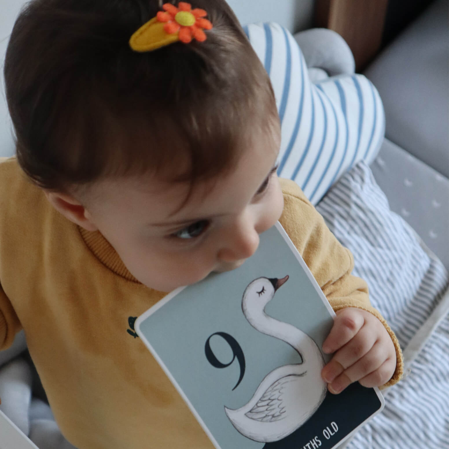 Unfortunately, when we were looking for multilingual flashcards in 2020, we couldn't find them. Also, most of the cards on the market were made of thin paper/cardboard or had designs on them that weren't cute or kid-friendly enough for us. When she was just under a year old, Bee was putting everything in her mouth; she even managed to nibble on or tear books made of thick cardboard so that they were no longer usable