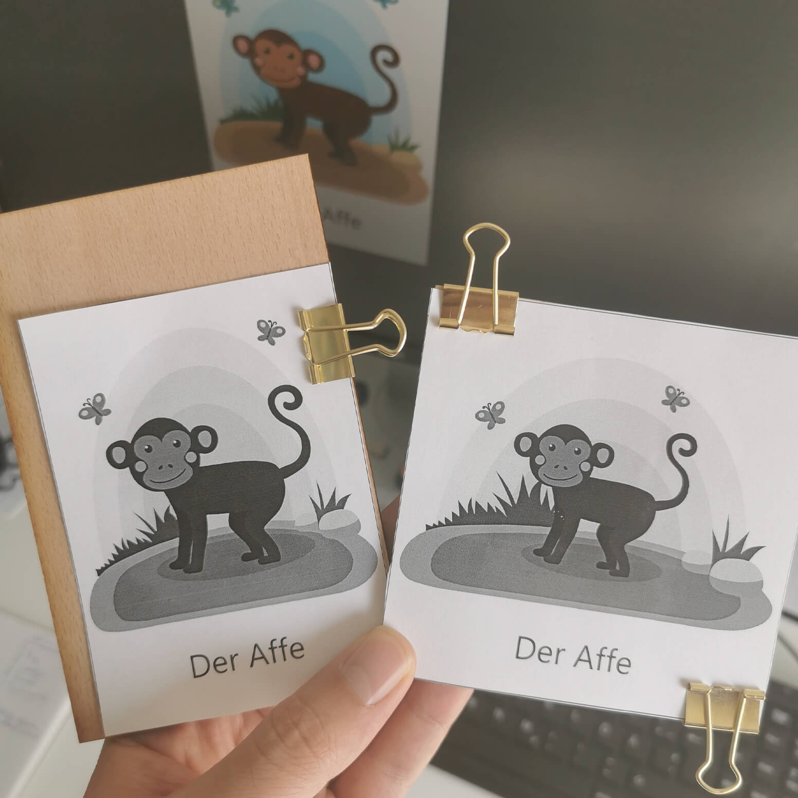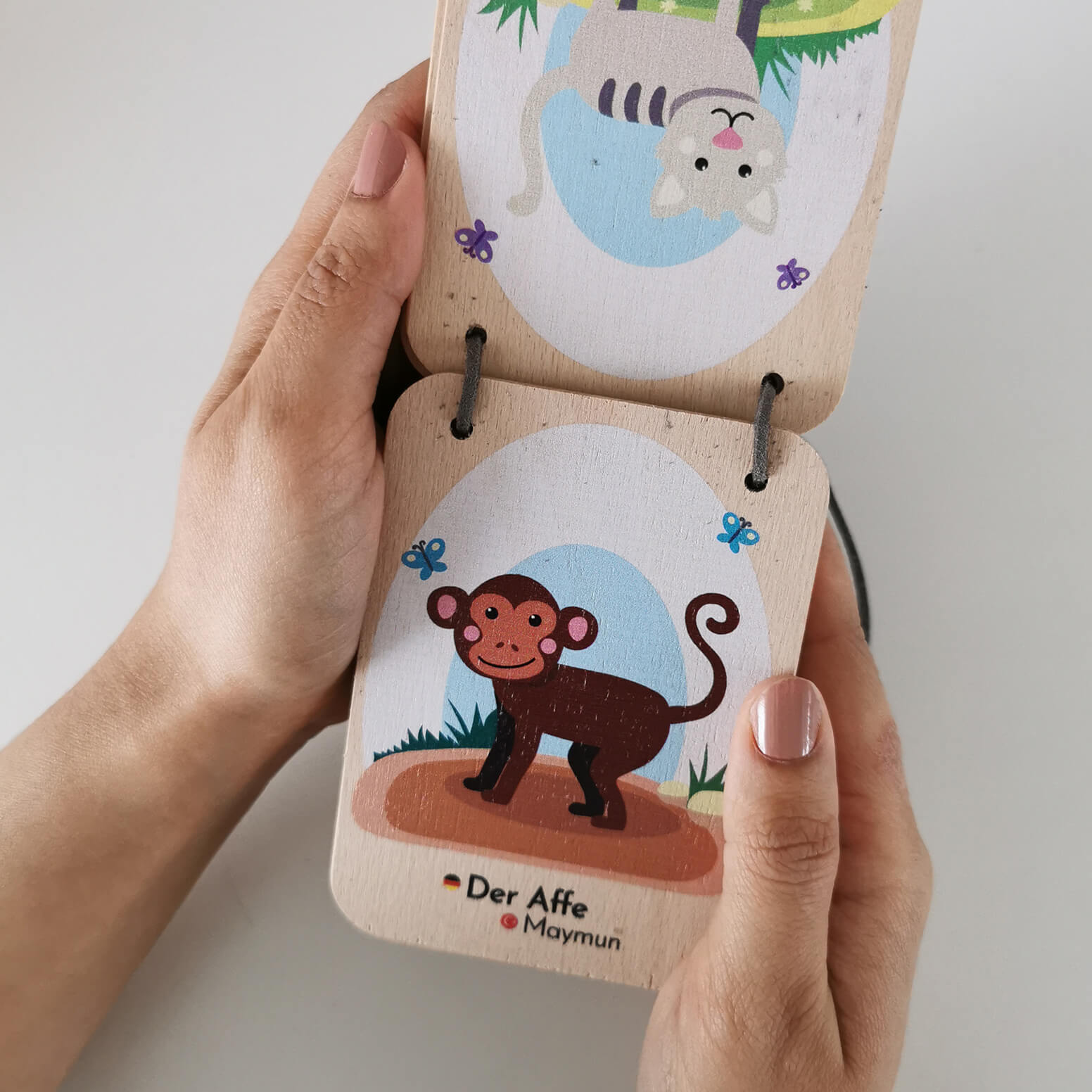 But we didn't give up and continued to research and talk to some carpenters. After about a year, many adjustments and numerous sample products, we have finally reached our goal and can proudly present our first learning game cards to you. We continued to develop the cards right during the production phase and always came up with new ideas. The flashcards can now be wonderfully hung up as a garland in the children's room or bound as a book and taken with you everywhere.
