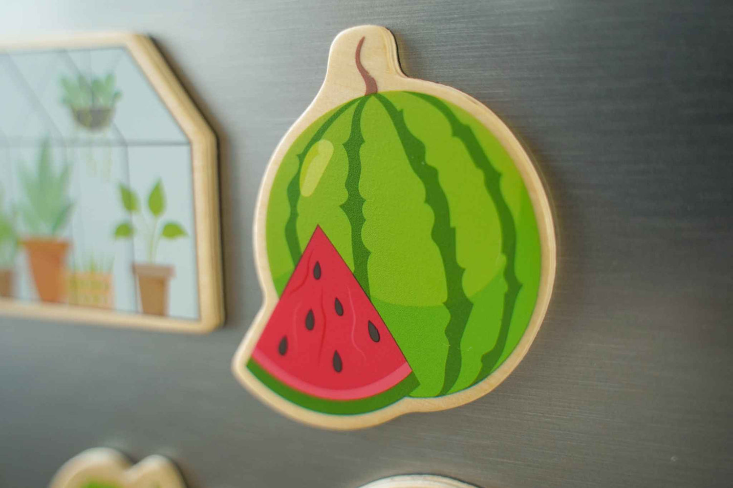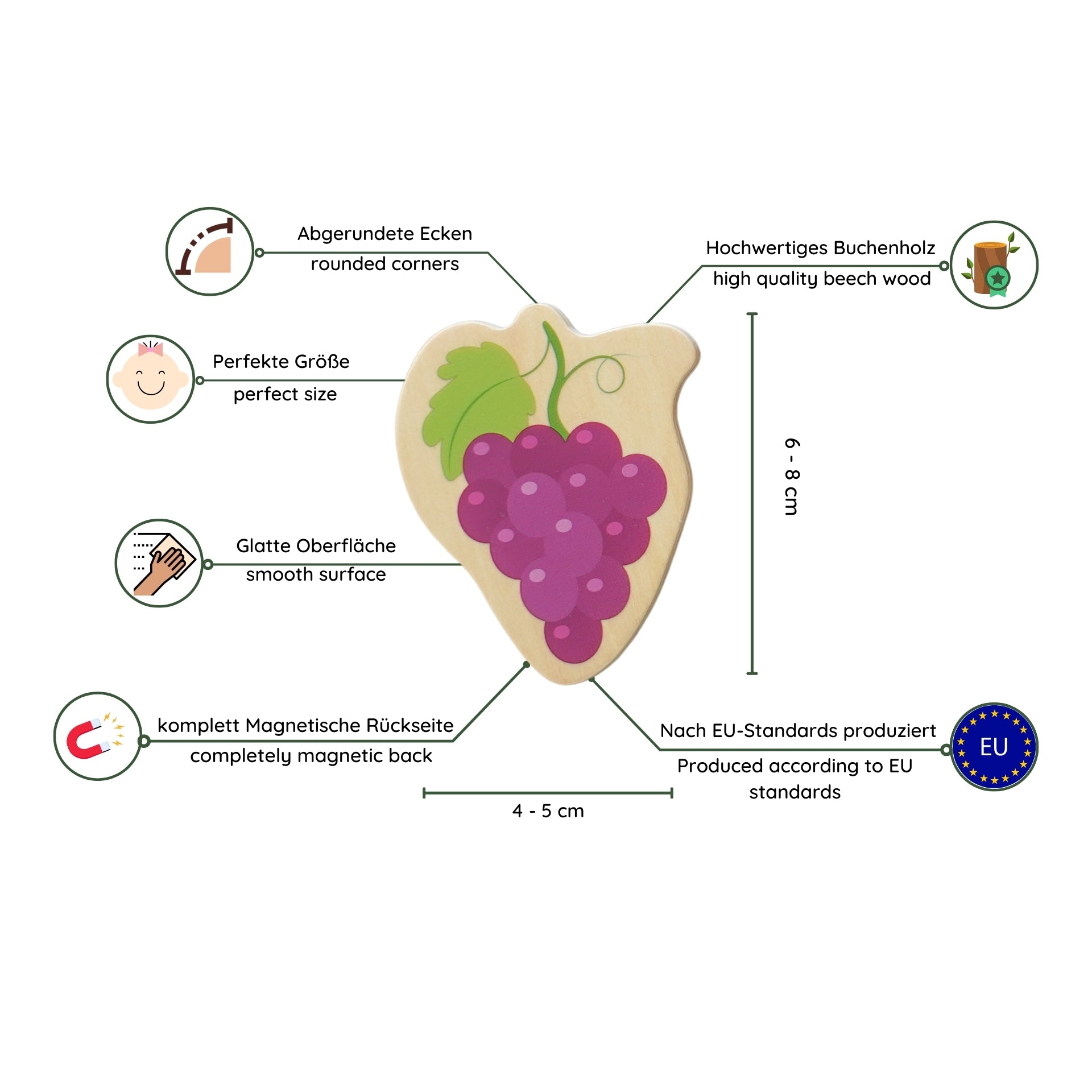 Unsere hochwertigen Holzmagnete mit Obst- und Gemüsemotiven werden mit großer Sorgfalt hergestellt. Jeder Magnet verfügt über eine glatte Oberfläche, abgerundete Ecken, um mögliche Verletzungen zu verhindern, und eine vollständig magnetische Rückseite, die für sicheren Halt auf Magnettafeln, Kühlschränken oder anderen Metalloberflächen sorgt.