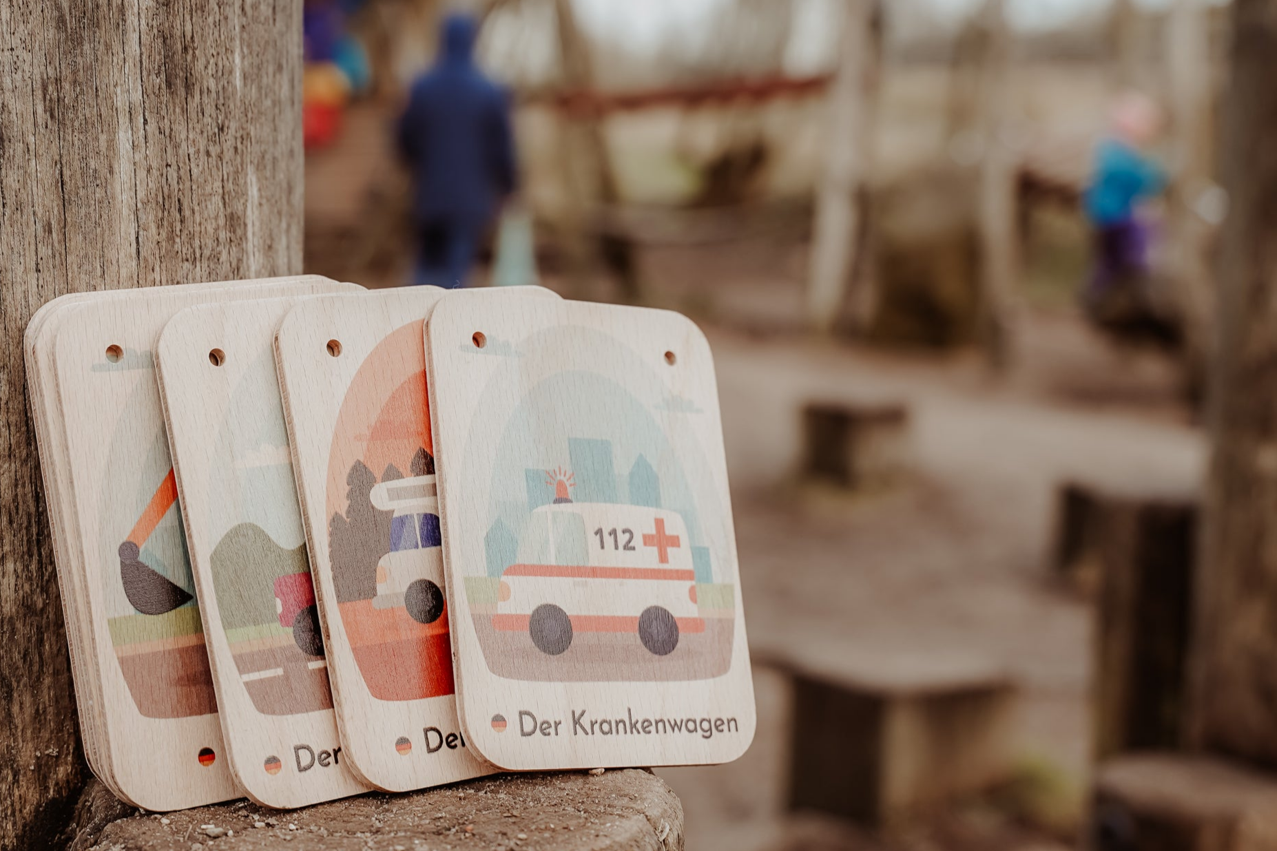 Durch das Greifen, Wenden und Aufhängen der Holzkarten werden die motorischen Fähigkeiten der Kinder spielerisch gefördert.