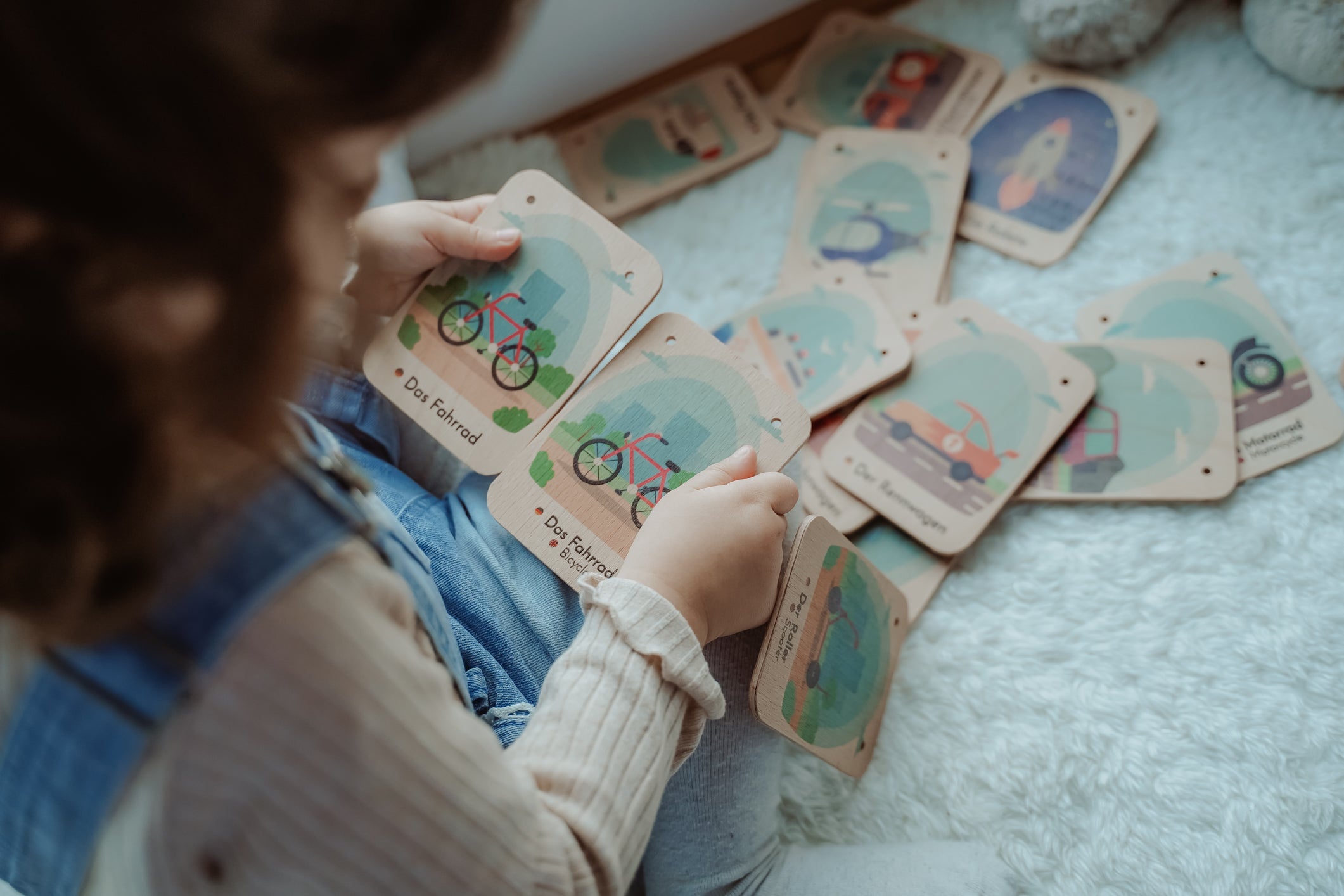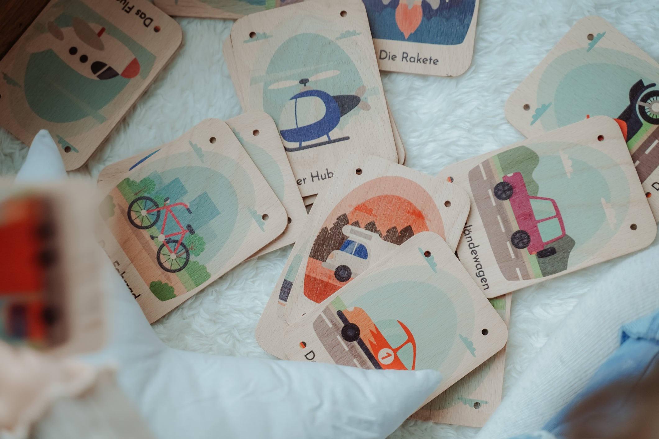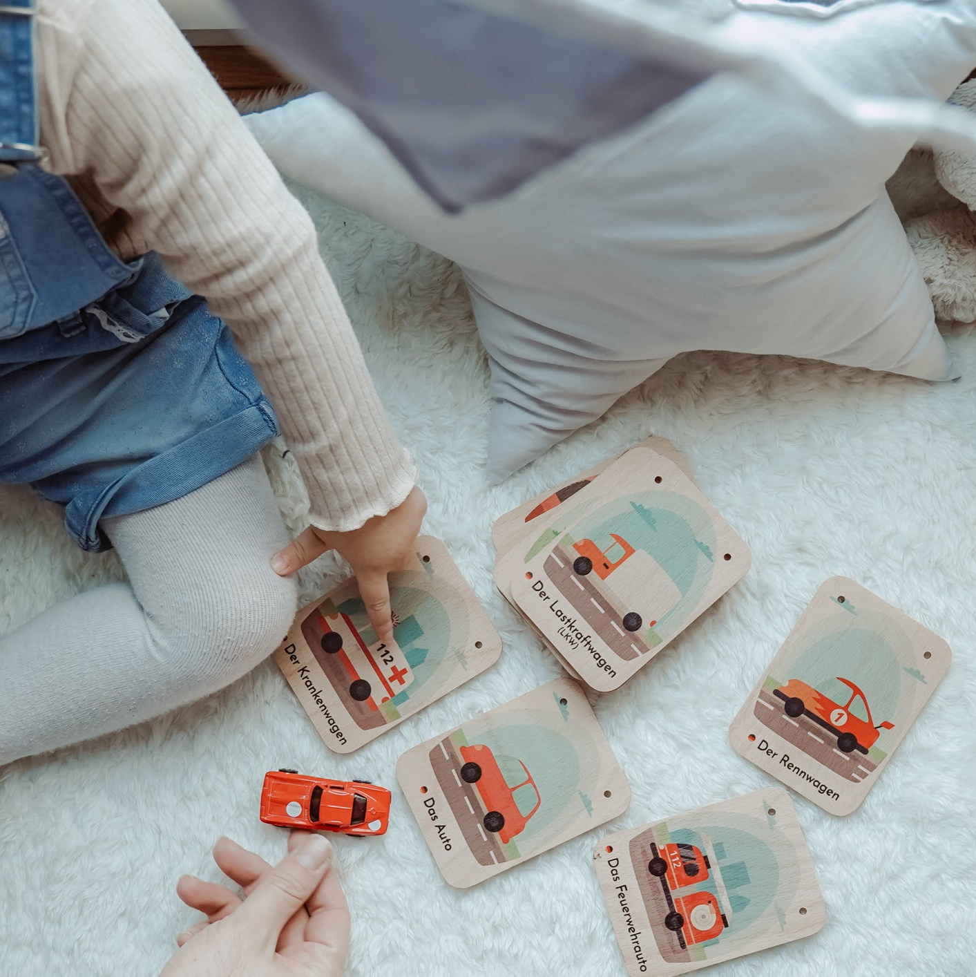 Das Set besteht aus 12 doppelseitig bedruckten Holzkarten, die 24 detaillierte und farbenfrohe Fahrzeugmotive zeigen. Jedes Fahrzeug ist sorgfältig illustriert, um die Neugier der Kinder zu wecken und ihnen auf unterhaltsame Weise neue Begriffe näherzubringen. Egal, ob zu Hause, unterwegs oder auf Reisen – unsere Lernkarten bieten endlose Möglichkeiten für lehrreiche und spannende Spiele.