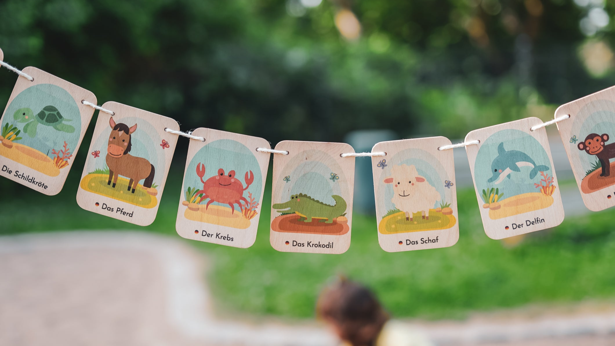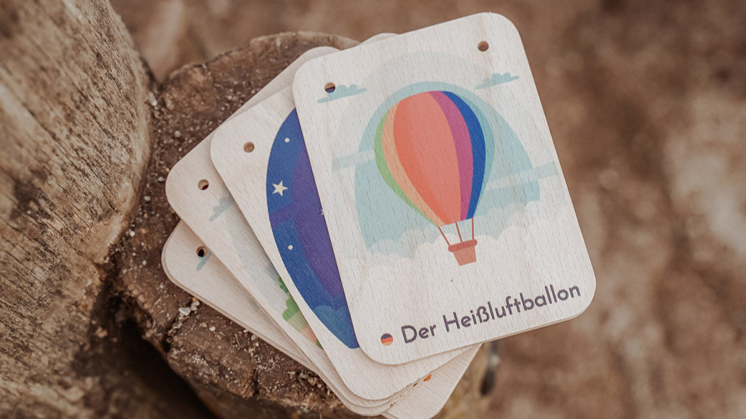 Unsere Montessori Lernkarten sind ideal, um gemeinsam die ersten Wörter in zwei unterschiedlichen Sprachen zu lernen oder den Wortschatz Ihres Kindes zu erweitern. Sie werden aus hochwertigem Buchenholz entsprechend europäischer Spielzeugrichtlinie 2009/48/EG hergestellt. Daher sind unsere Lernkarten speichelecht, haben natürlich glatte Oberflächen. Die meisten Schleifprozesse unserer Karten werden von Hand gefertigt und sie haben abgerundete Ecken und keine scharfen Kanten, um mögliche Verletzungen vorzubeugen.
