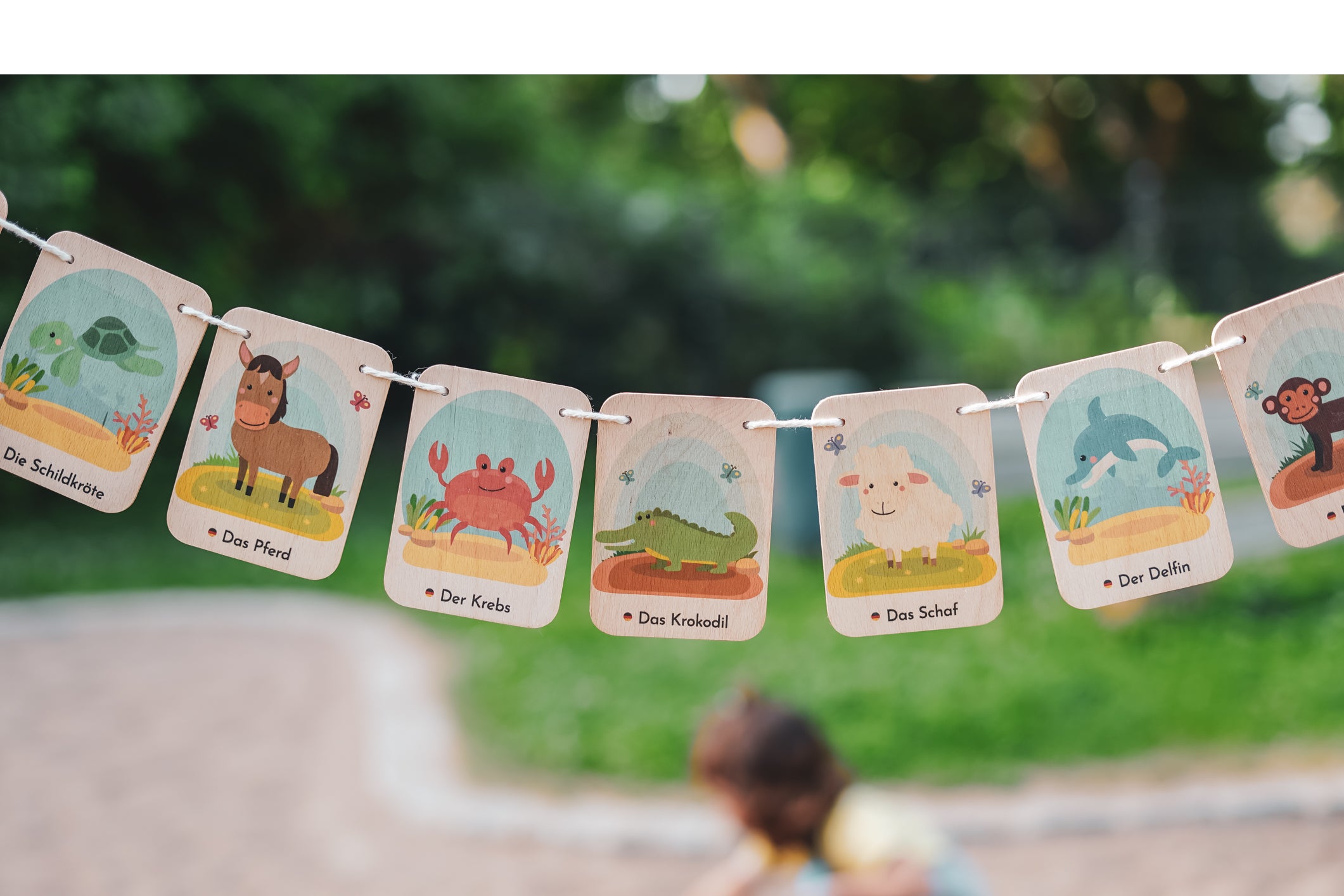 Durch das Greifen, Wenden und AufhΓ€ngen der Holzkarten werden die motorischen FΓ€higkeiten der Kinder spielerisch gefΓΆrdert.