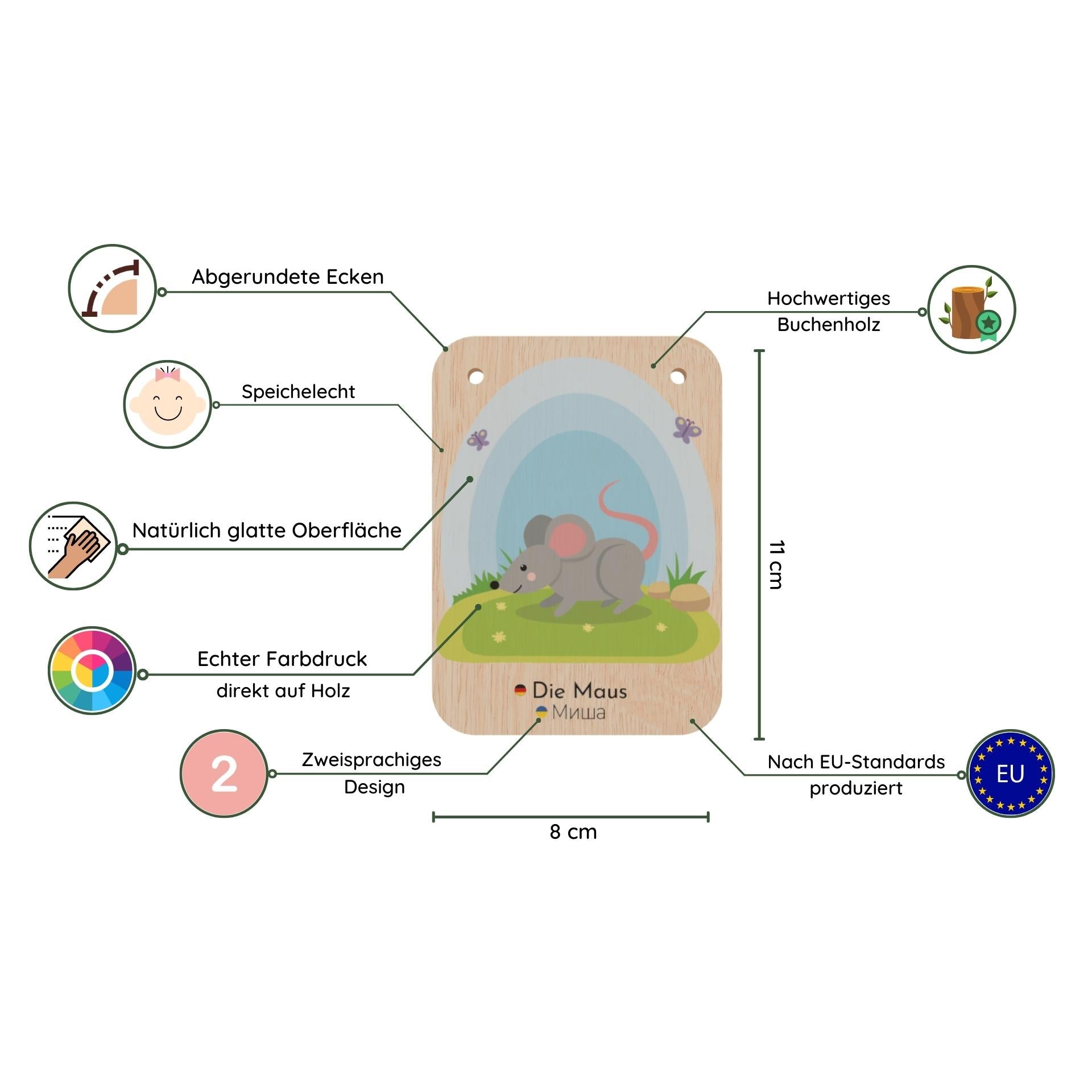 Wir nutzen ausschlieΓlich gesundheitlich unbedenkliches Holz, so dass unsere Karten schadstofffrei, speichelecht und bissfest sind. Sowohl das Holz, als auch die verwendeten Farben erfΓΌllen alle Vorgaben der
