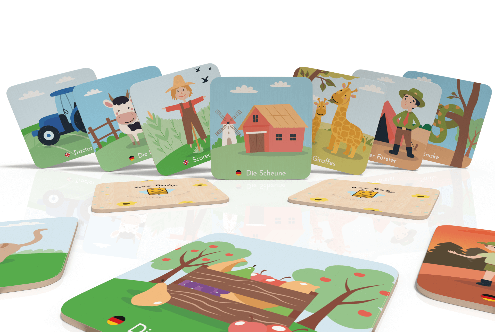 Jedes Set besteht aus 24 doppelseitig bedruckten Holzkarten (12 Paare), die entweder mit einem bilingualen Schriftzug oder klassisch ohne Beschriftung erhältlich sind. In der zweisprachigen Version sind die Kartenpaare so gestaltet, dass eine Karte das Motiv in einer Sprache und die andere Karte in der zweiten Sprache beschriftet ist. Auf diese Weise lernen Kinder spielerisch neue Wörter und trainieren gleichzeitig ihr Gedächtnis.