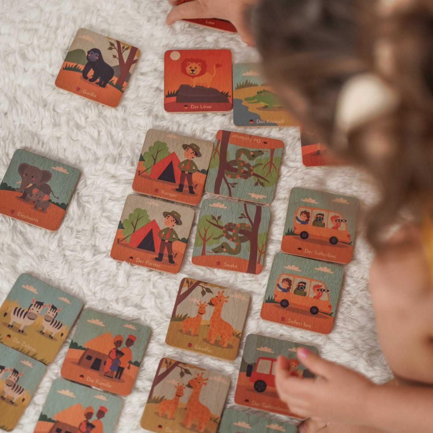 Jedes Set besteht aus 24 doppelseitig bedruckten Holzkarten (12 Paare), die in zwei Varianten erhΓ€ltlich sind: mit bilingualem Schriftzug oder klassisch ohne Beschriftung. In der zweisprachigen Version sind die Kartenpaare so gestaltet, dass eine Karte das Tier in einer Sprache und die andere Karte in der zweiten Sprache beschriftet ist. Auf diese Weise lernen Kinder spielerisch neue WΓΆrter, wΓ€hrend sie gleichzeitig ihr GedΓ€chtnis trainieren und mehr ΓΌber die spannende Welt der Safari erfahren.